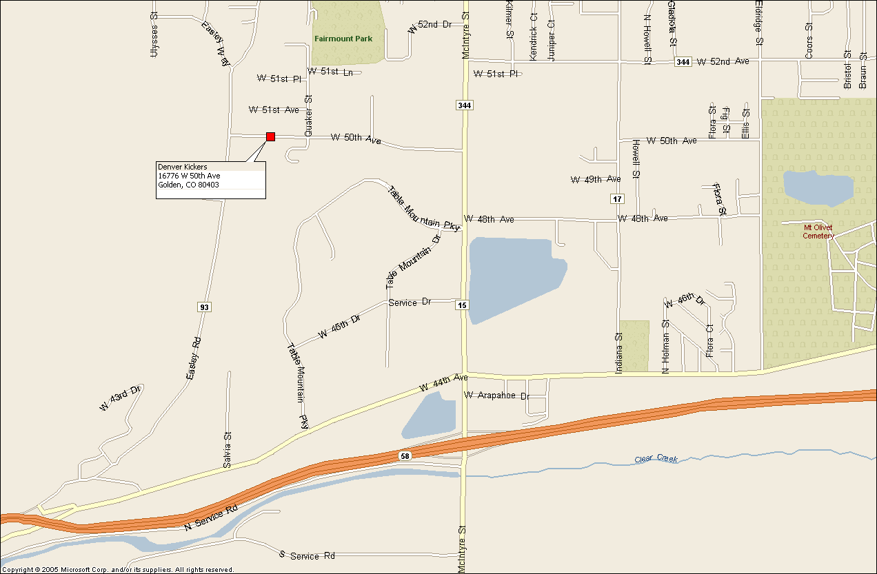 | Map Page for Denver Kickers Denver Kickers Club 16776 W. 50th Ave. Golden, CO 80403 Directions: I-25 and I-70. Take I-70 west to exit 265 which is Highway 58 West on Highway 58 to McIntyre Right (north) on McIntyre to 50th Ave. (Stop Light) Left (west) on 50th Ave. about 1 mile to Denver Kickers (white split rail fence on the left) There are two maps below Medium Map